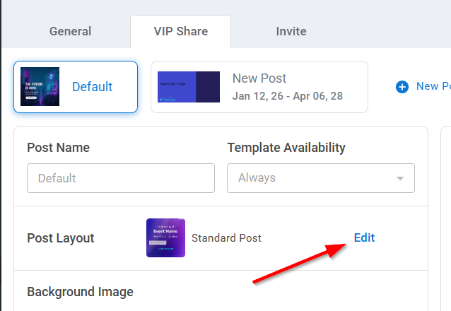 To get started, navigate to the Edit Group screen and select the VIPShare tab. On this page, you’ll find the Post Layout field. Clicking on the Edit button opens a pop-up modal where you can choose from available layout options, including Layout Type and Background Shape.