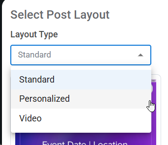 Once your Post Layout is configured, end users will see the available layout options directly in the widget when creating their social posts. These settings control how content is rendered, including format type, personalization behavior, and available sizes.