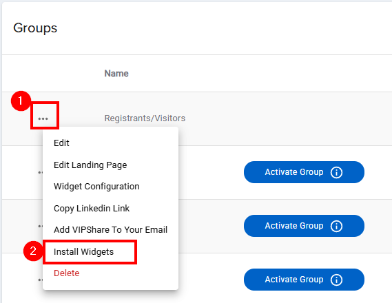 If a Group has already been activated and your users have started using the InGo widgets already, the Activate Group button will disappear and be replaced with some baseline metrics. At that point in time, the Install Widgets option will move to the dropdown menu. Clicking the ellipsis (...) button to the left of the Group name will open this menu where you can then find this option.